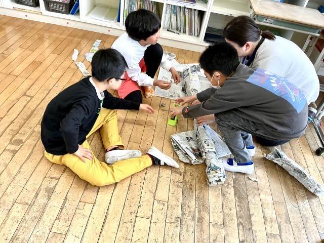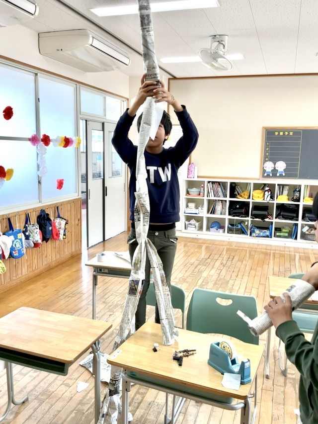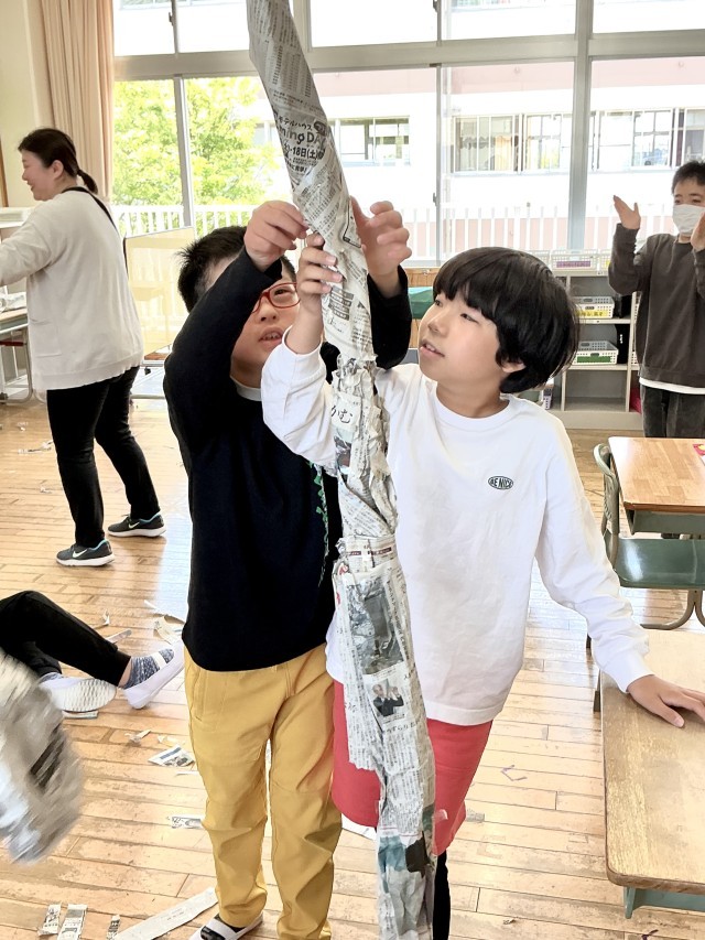 丸めたり、新聞紙を重ねたり、セロテープを使ったり、みんなで工夫しながら取り組みました。
