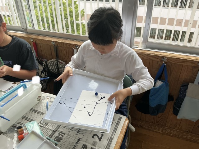 ストローでふいたり、ビー玉を転がしたりと、思い思いに絵の具の表現を試しました。
