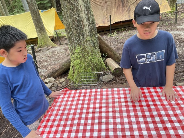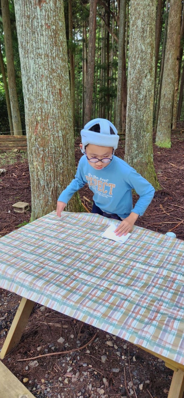 みんなが火おこしをしている間に、机をふきました。