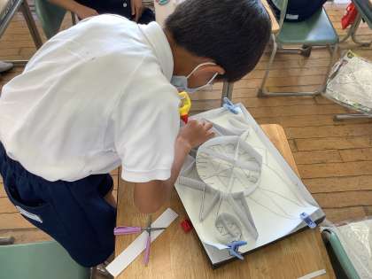厚紙の折り方や曲げ方を工夫しながら、貼っていきます。