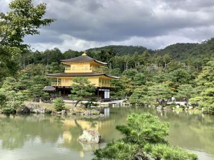 荘厳な金閣寺をバックに、「ハイ! チーズ!」。
