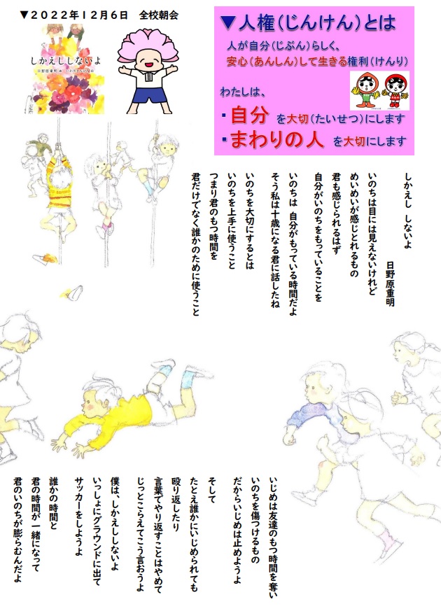 人権週間にちなみ、全校朝会で、日野原重明さんの詩「しかえしはしないよ」をもとに、校長先生がお話をしました。