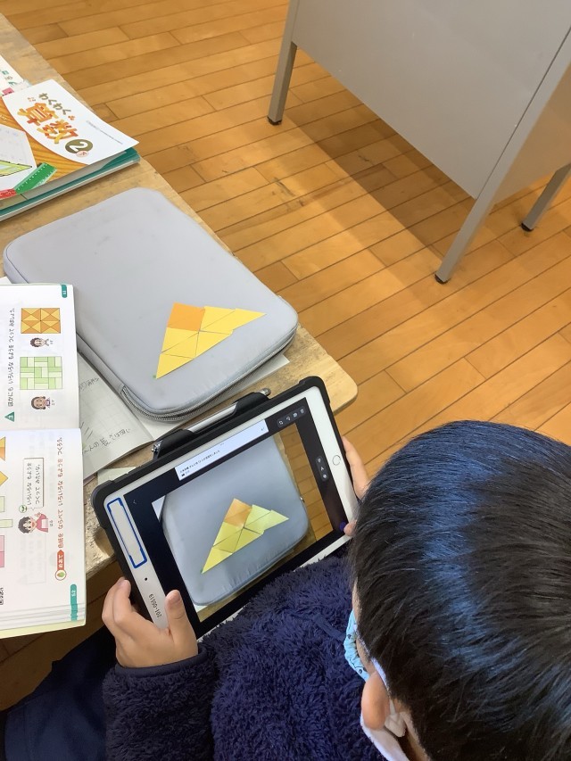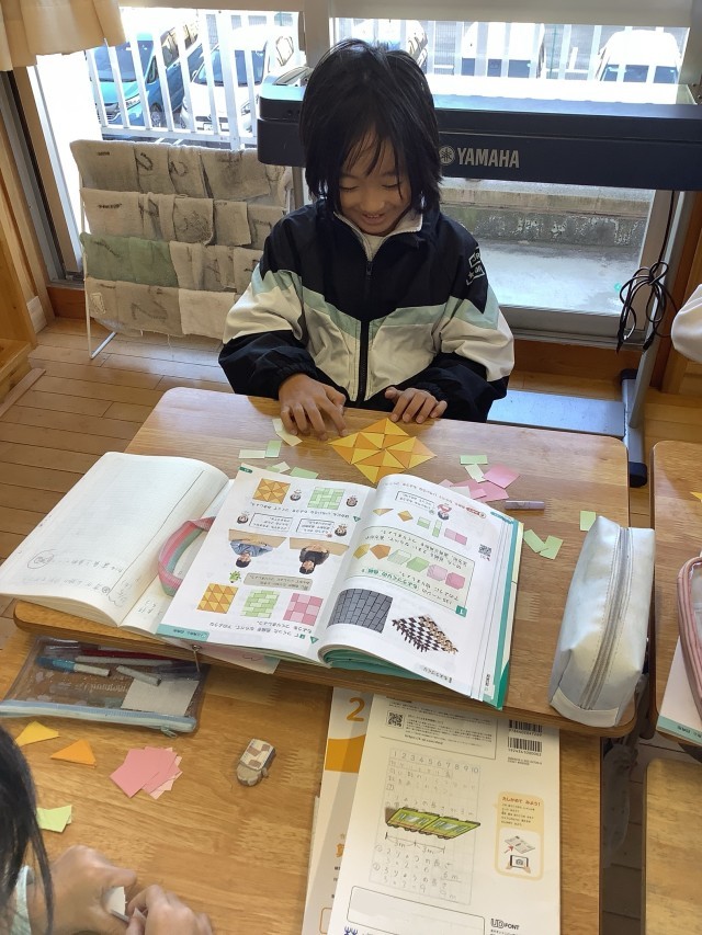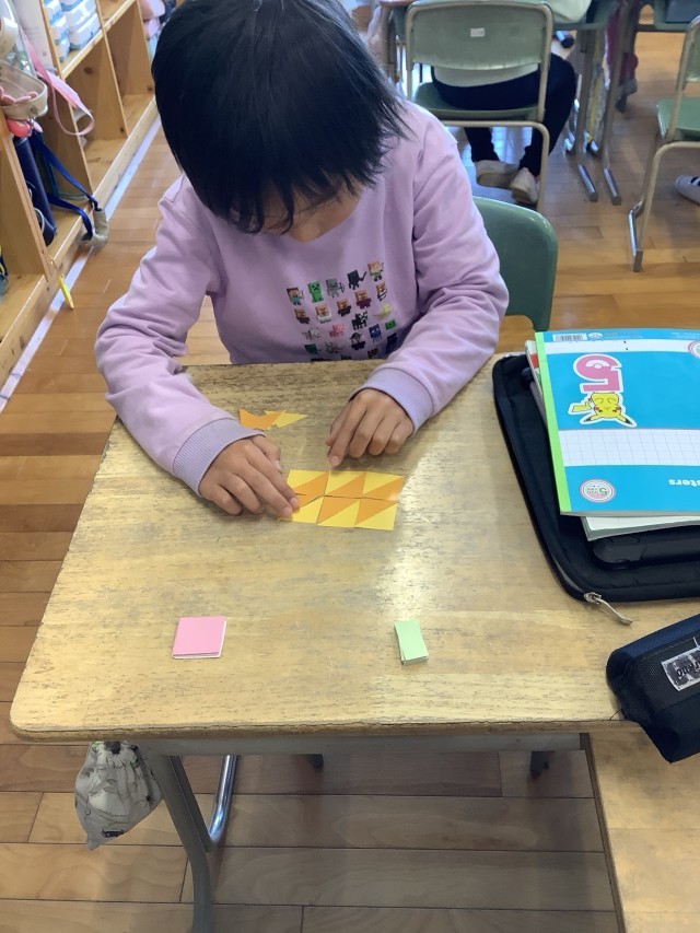 算数の授業では、長方形や正方形、直角三角形の特徴を学びました。それらの図形を並べてみると、様々なもようができ、新しい発見がありましたね。