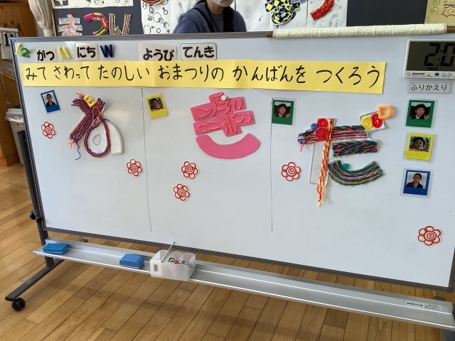 毛糸やおはながみなどを材料にして、もようを作って文字にはりつけています。