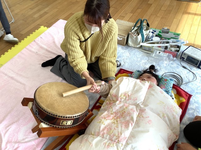 和太鼓を鳴らしてみました。和太鼓特融の音を聞きながら音の響きを感じていました。