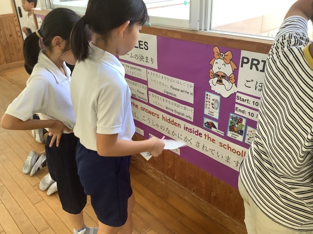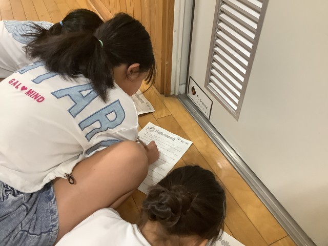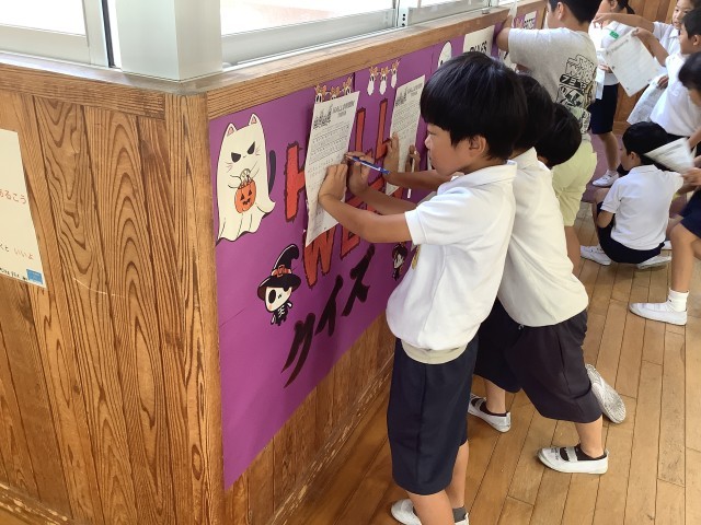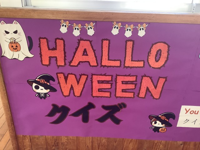 ALTの先生が企画したハロウィンクイズが盛り上がっています。絵をヒントにアルファベットを書いて英単語を見つけたり、校内にあるヒントを探しながらクイズに答えたりしています。楽しみながら、英語を学んでいます。