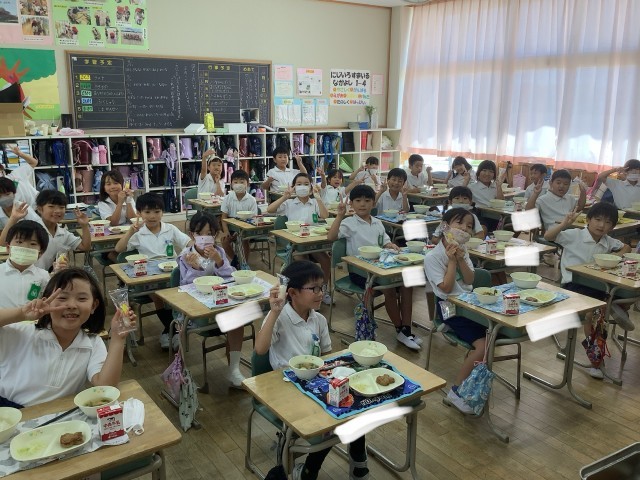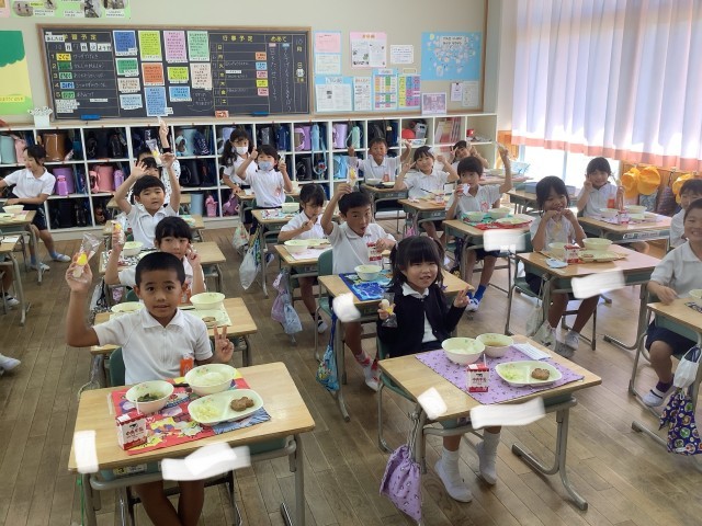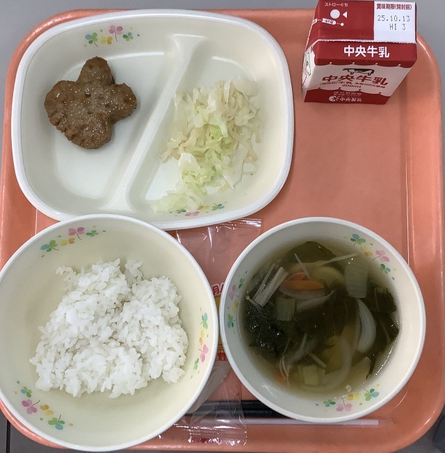 今日の給食は、お月見メニューです。うさぎの形をしたハンバーグ、里芋が入った月菜汁、月見団子などをおいしくいただきました。今日は十五夜です。まん丸お月様が見られるといいですね。