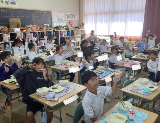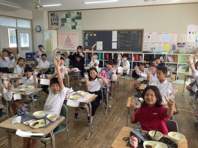 今日の給食は、新美南吉の「ごんぎつね」にちなんだこんだてです。ごんぎつねのお話に出てきたいわしや、南吉からのおくりもの、きつねの形をしたクッキーをおいしくいただきました。
