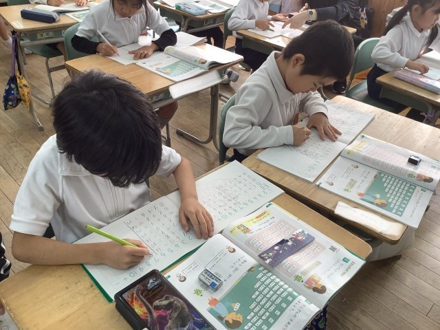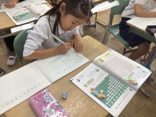 1年生の算数では、くり上がりのある計算をがんばっています。早く正確に計算できるよう、多くの問題に挑戦し、レベルアップをめざしています。