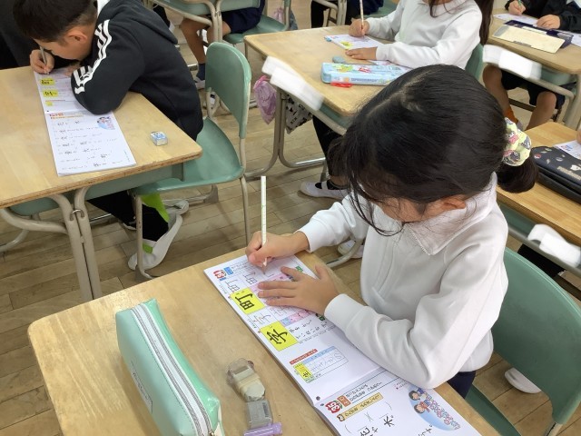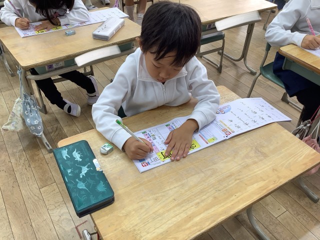 1年生の国語の授業では、「いろいろなふね」という教材を読み込んだり、漢字の学習をしたりして学びを深めています。「いろいろなふね」では、客船などそれぞれの船の役割を教材文から見つけてノートにまとめています。漢字の学習では、花、文、町、音などの新しい漢字の書き取りに取り組み、とめ、はね、はらいに気をつけてていねいに書いています。落ち着いて学習に取り組む1年生たち、すばらしいです。