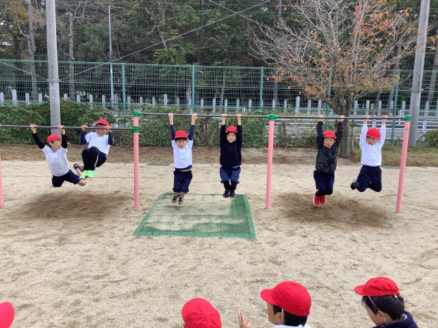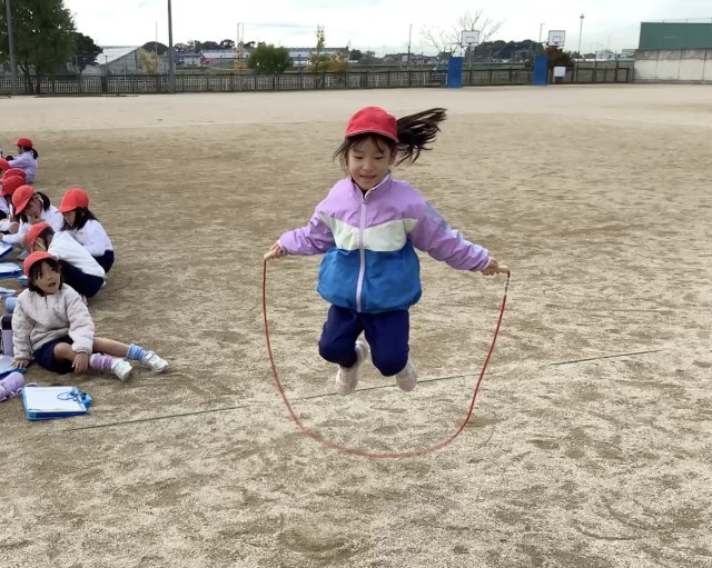 1年生の体育では、寒さに負けない体づくりをしています。かけ足をしたり、鉄棒をしたり、なわとびをしたりして、体を鍛えています。