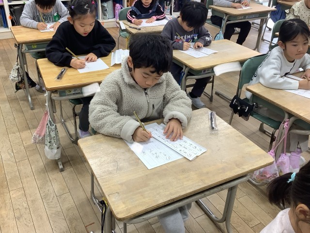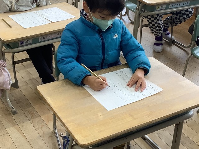 1年生にとって、初めての書き初め会です。手本をしっかりと見ながら、硬筆でていねいに書いていました。