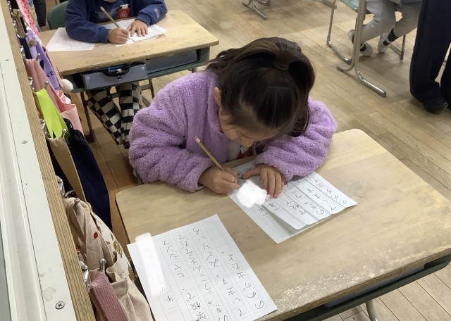 1年生の国語の授業では、「いろいろなふね」という教材を読み込んだり、漢字の学習をしたりして学びを深めています。「いろいろなふね」では、客船などそれぞれの船の役割を教材文から見つけてノートにまとめています。漢字の学習では、花、文、町、音などの新しい漢字の書き取りに取り組み、とめ、はね、はらいに気をつけてていねいに書いています。落ち着いて学習に取り組む1年生たち、すばらしいです。