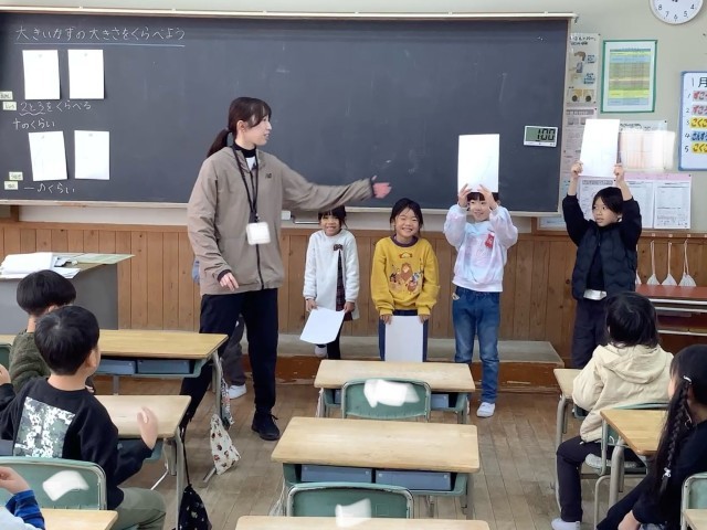 1年生の算数では、100までの数の学習をしています。グループに配られた数字のカードを、大きい順に素早く並べ替えて、大きさ比べをしました。十の位から見比べるといいことを確認して、大きい順が合っているかみんなで確かめました。