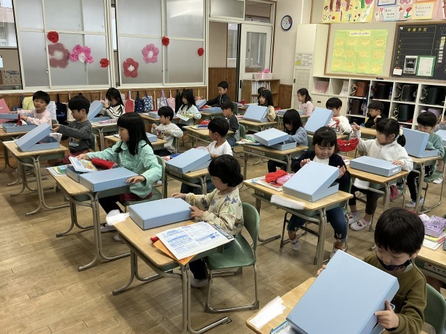 入学式の後の1年生の様子です。教科書を確認したり、荷物をしまったりして、さっそく明日からの勉強の準備をしています。