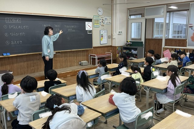 1年生が、漢字の学習をがんばっています。黒板に書かれたお手本を見ながら、一文字ずつていねいに書いています。間違えやすい字も確認しながら、正しい字を覚えています。