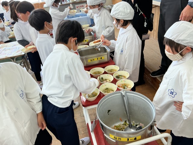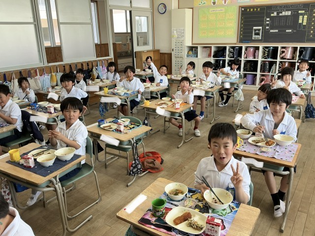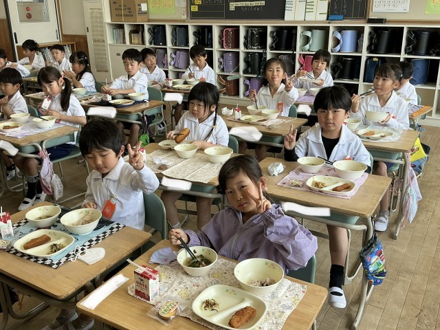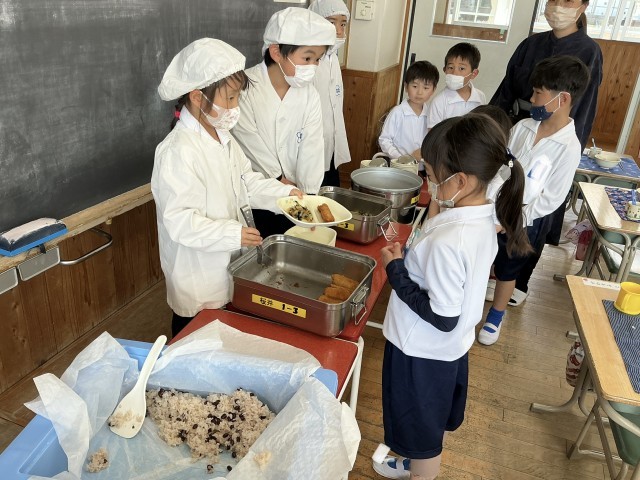 1年生にとって、初めての給食です。給食当番が力を合わせて給食の準備をしました。今日のメニューは、お祝いメニューです。おいしくいただきました。
