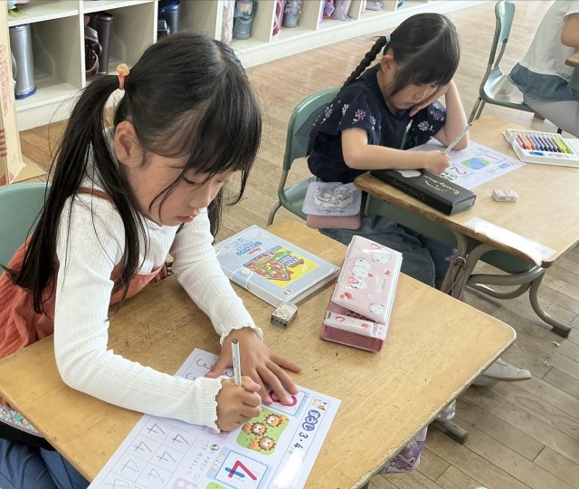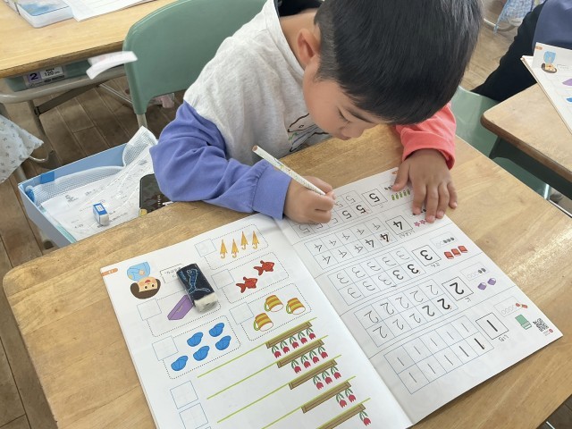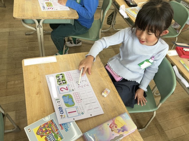 1年生の算数では、数字の勉強をしています。数を数えて、数字を書きます。形に気をつけながら、ていねいに書きました。