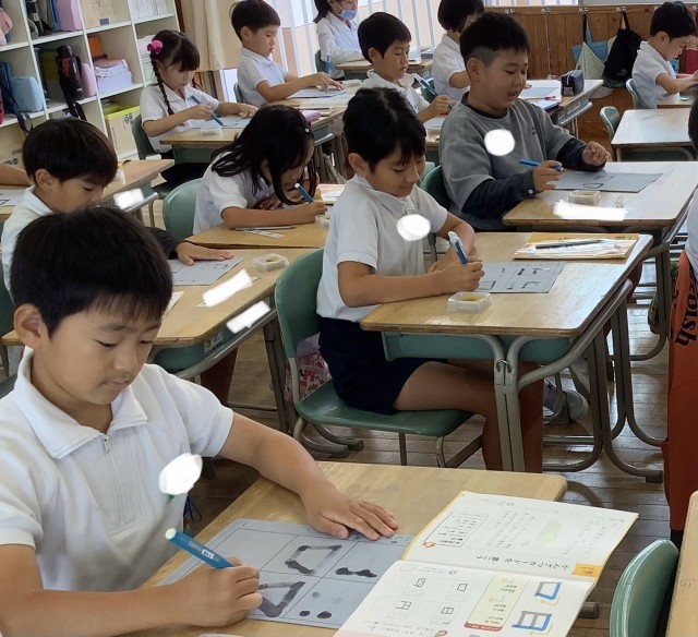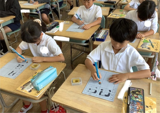 折れの方向について学習しました。真下に折れるのか、内側に折れるのか。漢字に合う折れを、水書筆を使って練習しました。