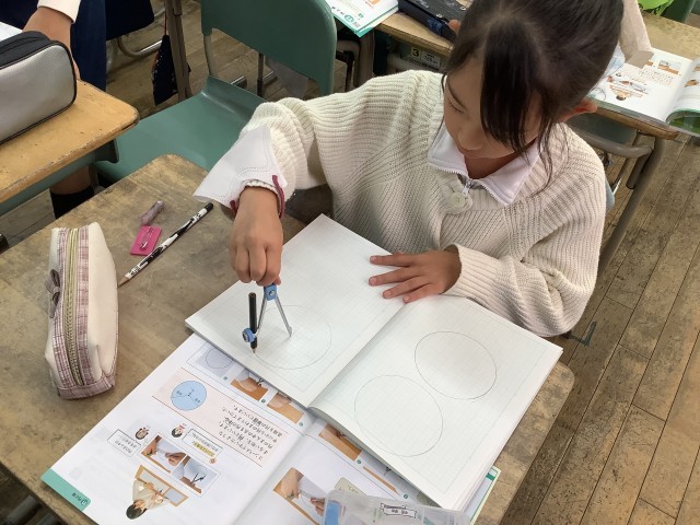 コンパスを使って円をたくさんかき、使い方の練習をしました。