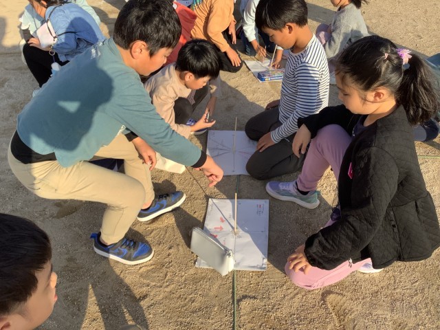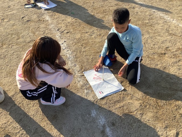 自分たちで準備した実験器具を使って、太陽と影の関係を調べました。