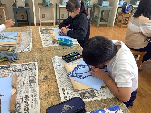 4年生の図工では、木版画に取り組んでいます。三角刀や丸刀などの彫刻刀を使い分け、昆虫の細かい部分まで地道に彫り進めています。完成が楽しみですね。