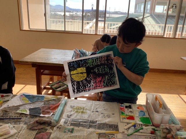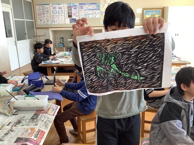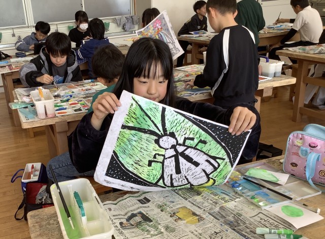 4年生の図工では、木版画に挑戦しています。虫を彫り、印刷したものを、裏から絵具で色をにじませることによって、鮮やかな作品位仕上げています。