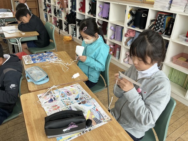 4年生が、桜井凧保存会のみなさんに教えてもらいながら、角凧作りに挑戦しました。竹ひごを組み合わせて凧を作っていきます。どうやったらうまく作れるか、保存会のみなさんに質問をしながら、完成させていきました。桜井っ子たちは、地域の方たちに支えられて心豊かに育っていきます。桜井凧保存会のみなさん、ありがとうございます。