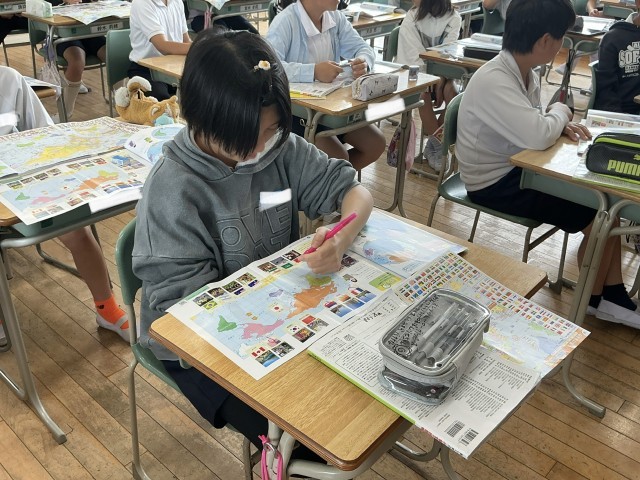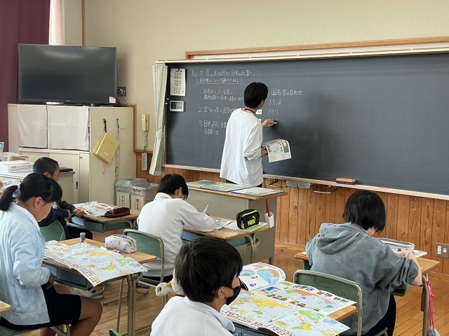 5年生の社会では、世界の国々について調べています。その国の国旗や位置、特徴、日本との関係などを調べて、発表し合っています。