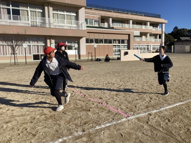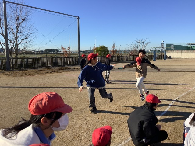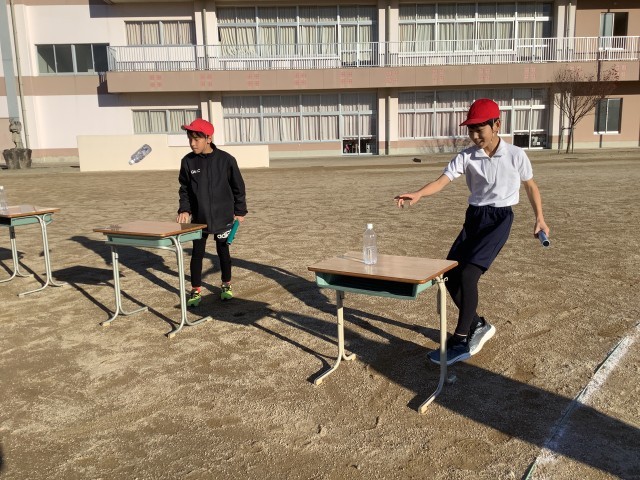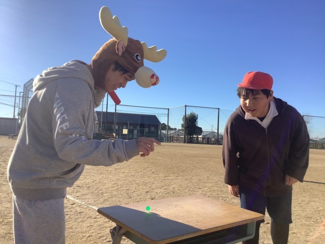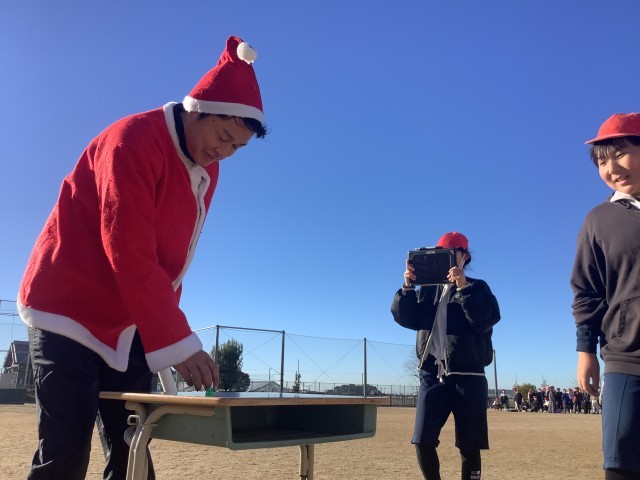 障害物リレーを行い、けんけんぱやサイコロ、ミニハードルやペットボトルフリップなどの、種目をところどころに配置し、速さだけでなく運も勝負に関係する楽しいレクリエーションとなりました。担任の先生もサンタやトナカイの帽子をかぶって、みんなと一緒に走りましたよ。