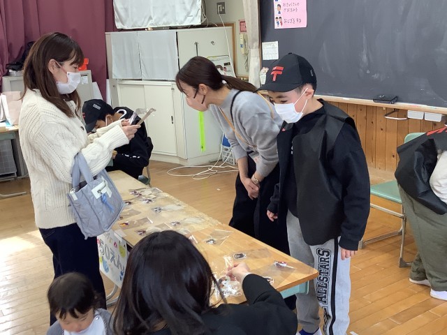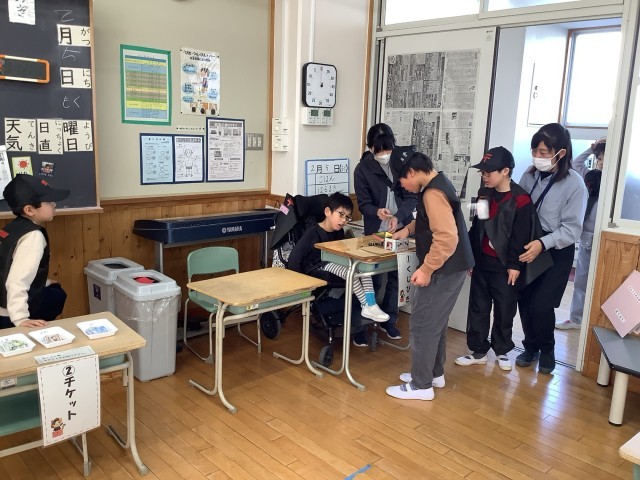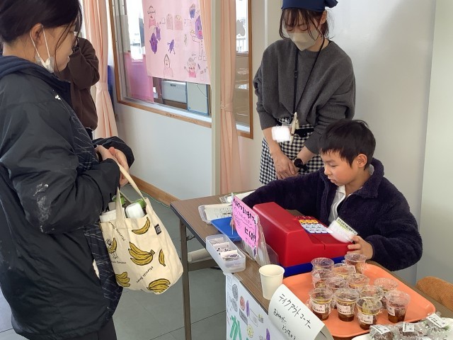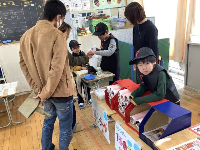 さくら1、2、5、8組の学習発表会の様子です。郵便局をがんばったことを発表したり、グッズ販売をしたりしました。