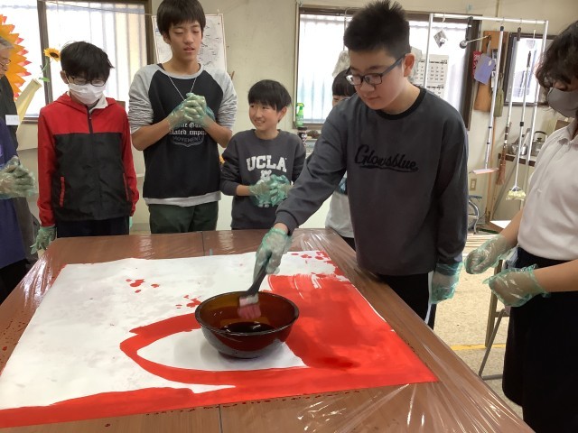11月12日(木)に、三ツ川凧愛好会の方の協力で6年5組は大凧作りをしました。色...