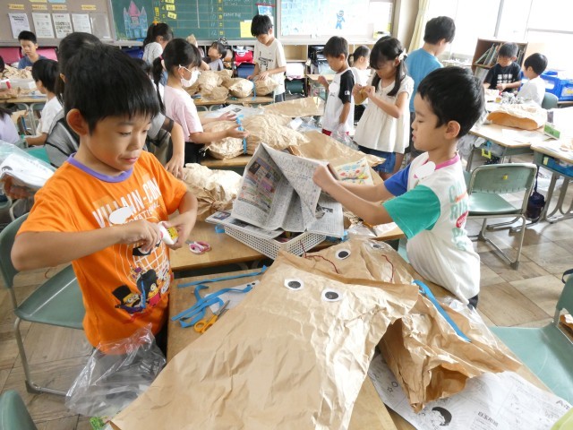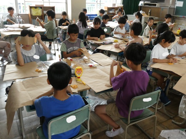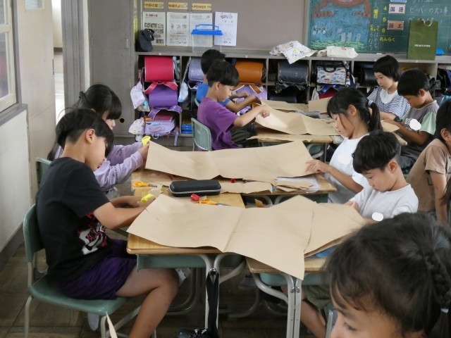 図工で、クラフト紙を用いて大きな作品を作っています。力が必要な時に一緒に押さえたり、リボン結びの作り方を教え合ったり、お互いに助け合いながら作品をよいものにしようとする、素敵な姿が見られました。