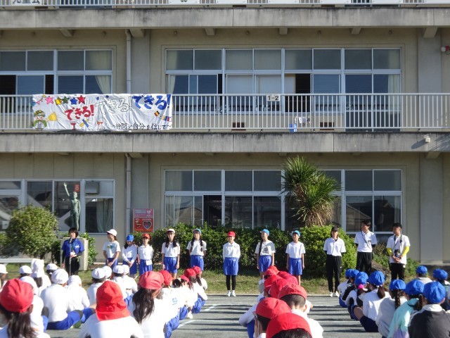 開会式では、代表委員がてきぱきと進行を務めました。校長先生も代表委員長もスローガンにある「仲間と自分を信じて」について触れ、信じて頑張ることについて全校に呼びかけました。