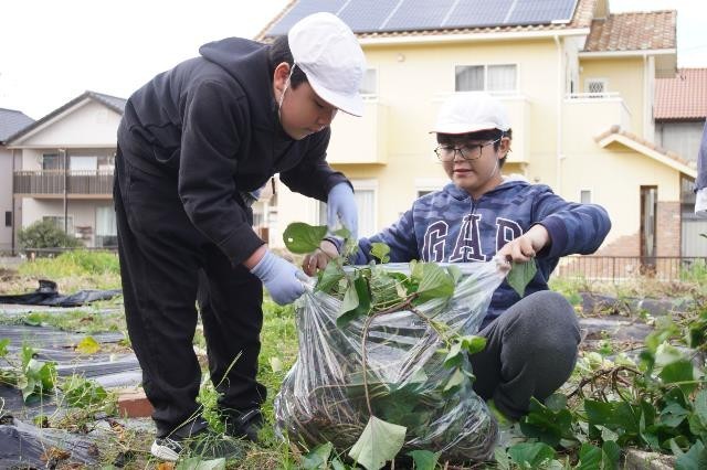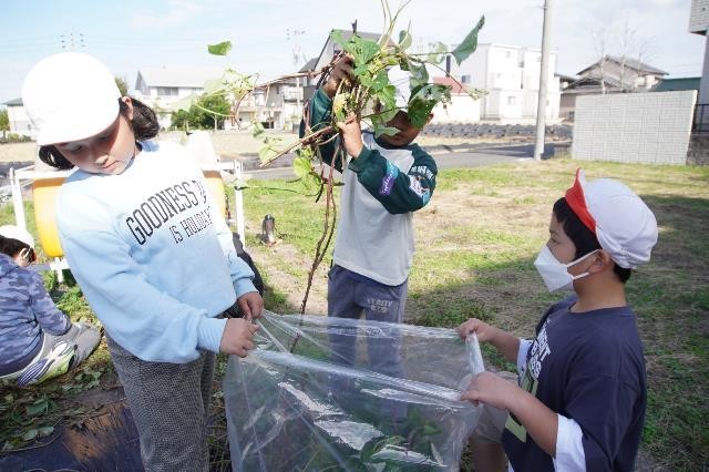さつまいもほりのために、大きく成長したさつまいものつるを刈りました。友達と協力して、袋がいっぱいになるまでつるを集めました。最後は上級生が学校まで運びました。