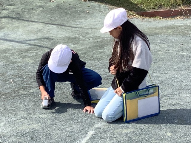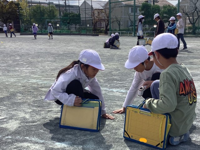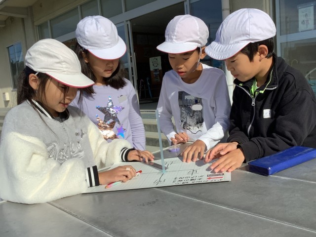 理科「太陽とかげ」「太陽の光」の学習では、かげの向きを調べたり、地面の温度を確かめたり、はね返した日光の進み方を調べたりしました。