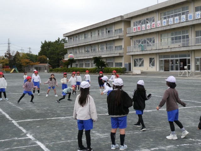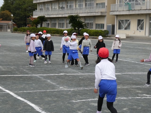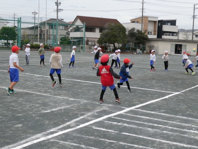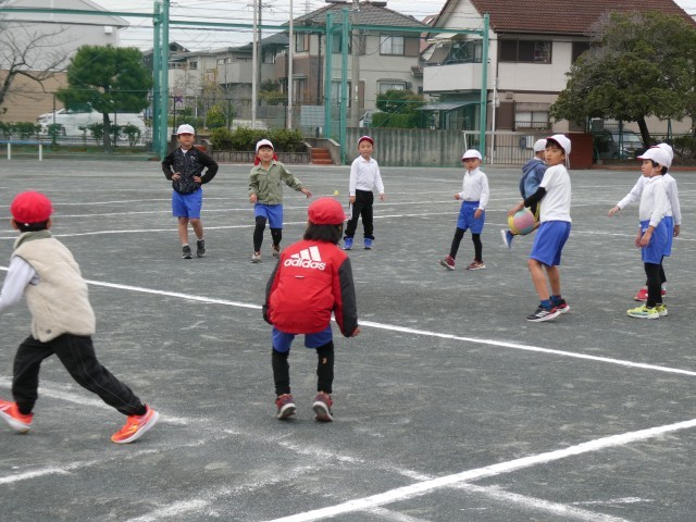 1組と2組合同でドッジボールを行いました。力いっぱい体を動かすと、あたたかくなりますね。