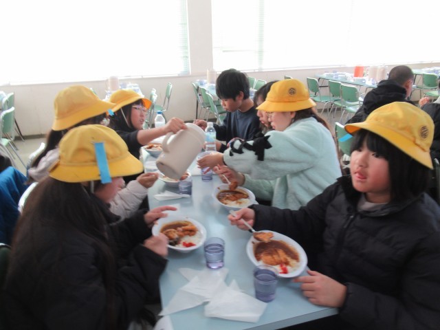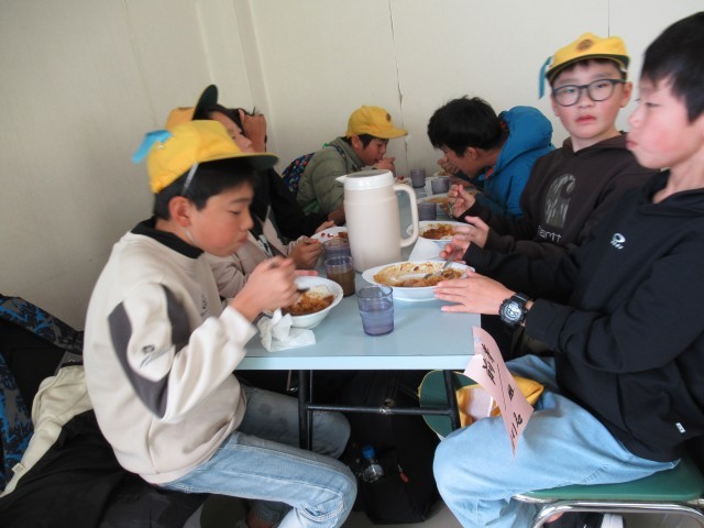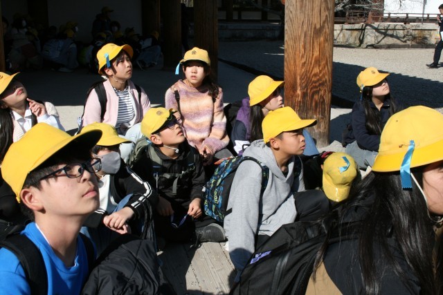 昼食はみんなでカツカレーを食べました。東大寺でたくさん動いたからなのか、あっという間に食べ終わっていました。昼食の後は、法隆寺に見学に行きました。世界最古の木造建築をじっと見つめ、ガイドさんの話を静かに聞いていたのが印象的です。