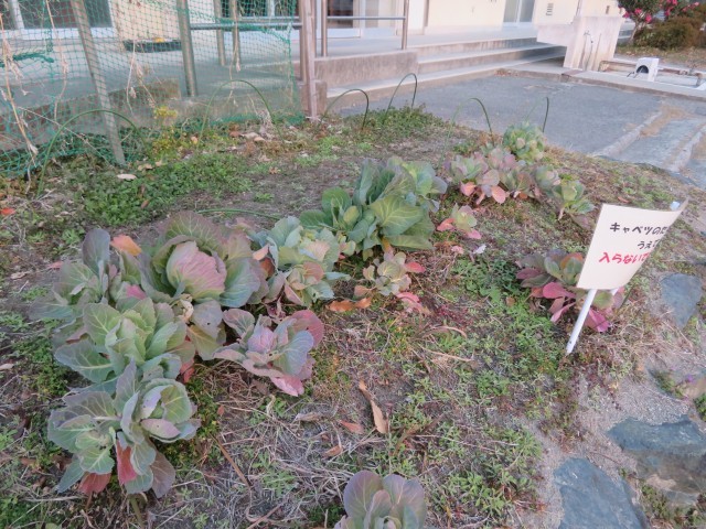 冬らしい寒い日が続いています。寒いなか、校庭ではパンジーやサザンカなどが咲いています。マリーゴールドは秋の花と思っていましたが、冬場も長く咲き続けています。理科の花壇では、夏になかなか大きくならなかったキャベツの苗がどんどん育ってきました。不思議ですね。