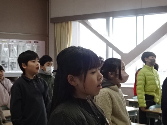児童代表の子の話を真剣に聞き、校歌を元気よく歌いました。