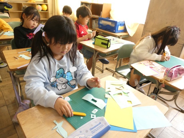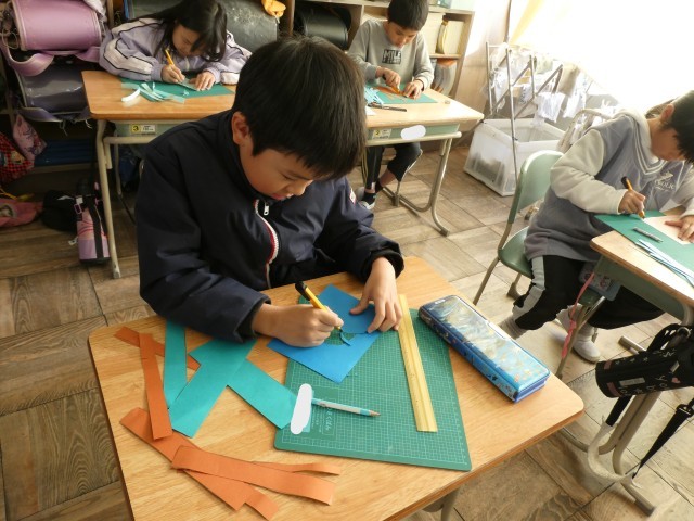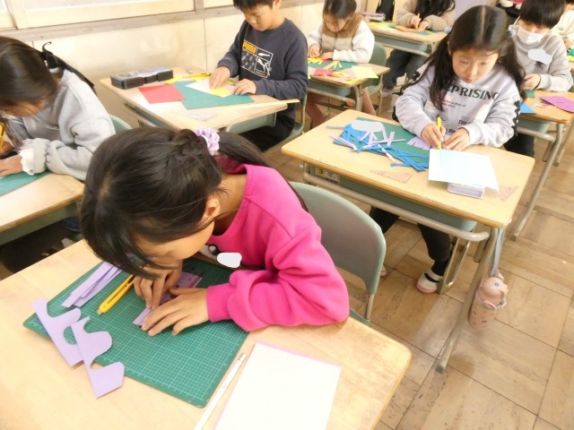 図工でカッターナイフの練習をしました。持ち方、刃の出し方、切り方など、ひとつひとつの動作を確認しながら安全に紙を切ることができました。
