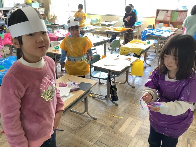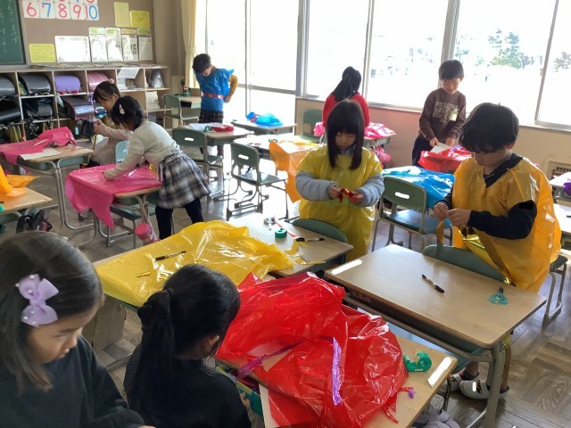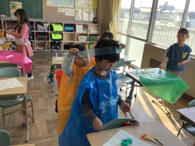 図工で「つくってへんしん」の学習をしました。カラフルで大きなビニール袋に切り込みを入れて袖を通すだけで、みんな大喜びです。きらきらのテープや色画用紙などで楽しく飾ったり、被り物や手に持つアイテムなども作ったりしました。来週で完成。どんな変身を遂げるかわくわくします。