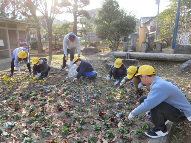 5年生は花壇のパンジーの花摘みと落ち葉集めをしました。花を摘むことによって花の株が大きくなります。落ち葉がいっぱいの花壇もとてもきれいになりました。