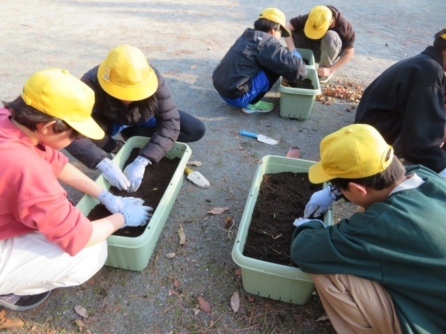 6年生は協力して新しい鉢に土を入れて、チューリップの球根を手際よく植えました。何色の花が咲くのか、春がとても楽しみですね。