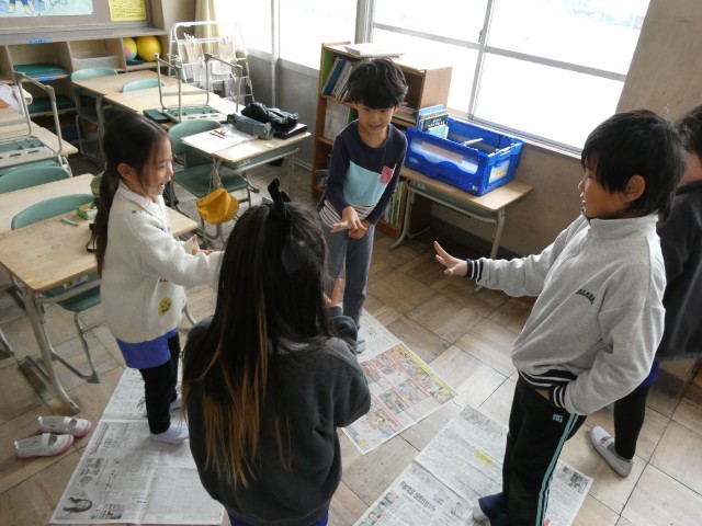 なかよしタイムがありました。1組はなんでもバスケット、2組は新聞じゃんけんを楽しみました。