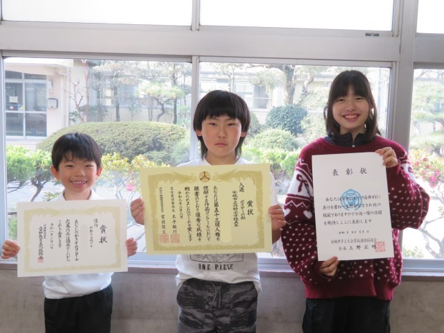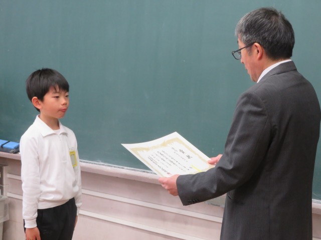代表委員が「3学期のまとめをしましょう」と挨拶したあと、子供会や人権ポスター、書き初めの表彰がありました。
