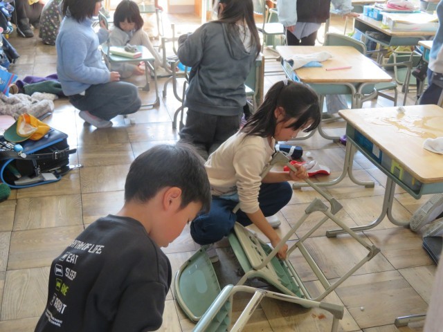 低学年の子どもたちも自分が使った机やいすの汚れを丁寧に落としていました。