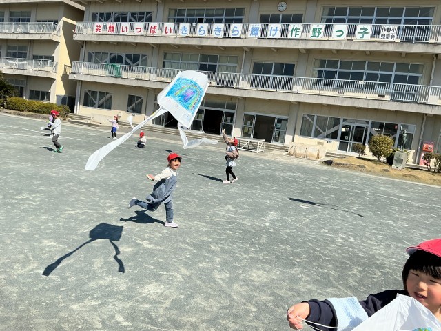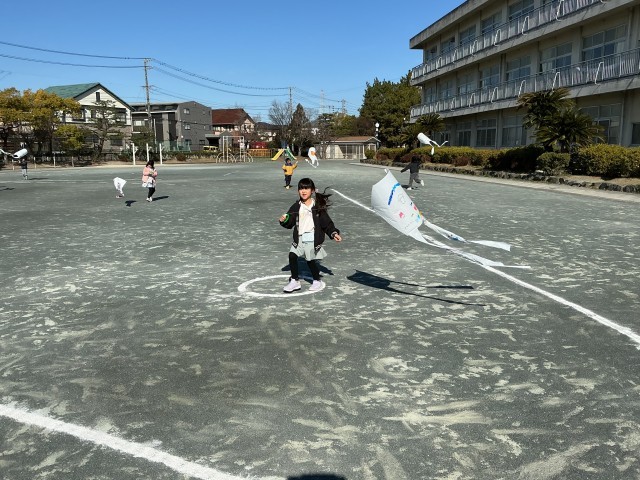生活科の学習で、凧揚げをしました。多くの子が走り回って楽しんでいましたが、中には糸をかなり伸ばして高く揚げている子もいました。