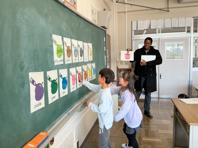 外国語の時間には、歌を聞いたり、ゲームをしたりして色についての学習をしました。
