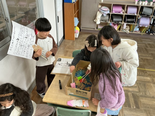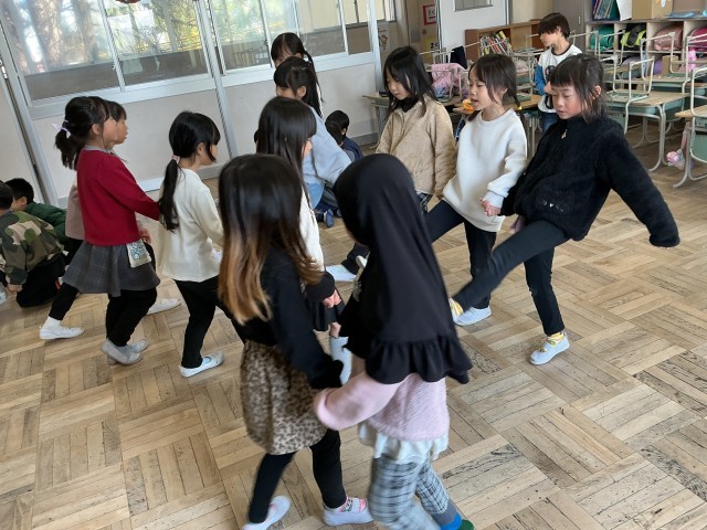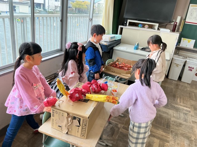 1年生最後のお楽しみ会。花いちもんめや的当て、お祭り、カラオケ、劇など、自分たちで工夫していろいろな企画を楽しみました。